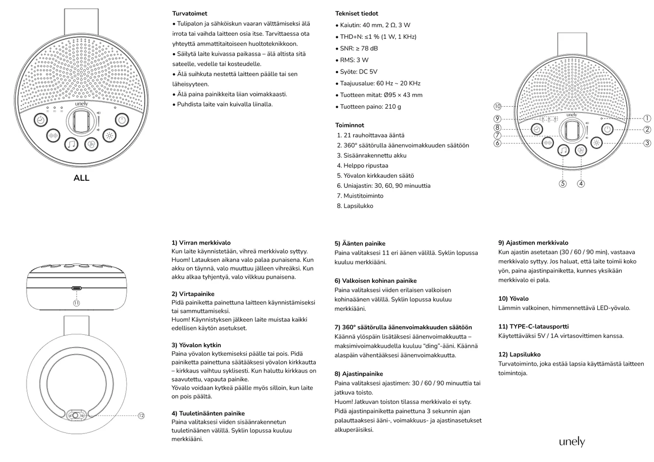 Unely ALL on ihanteellinen valinta perheelle, joka haluaa käyttää kohinakonetta sekä kotona että kodin ulkopuolella. Laadukas ääni, pieni yövalo ja erittäin kätevä rulla äänen säätämiseen.