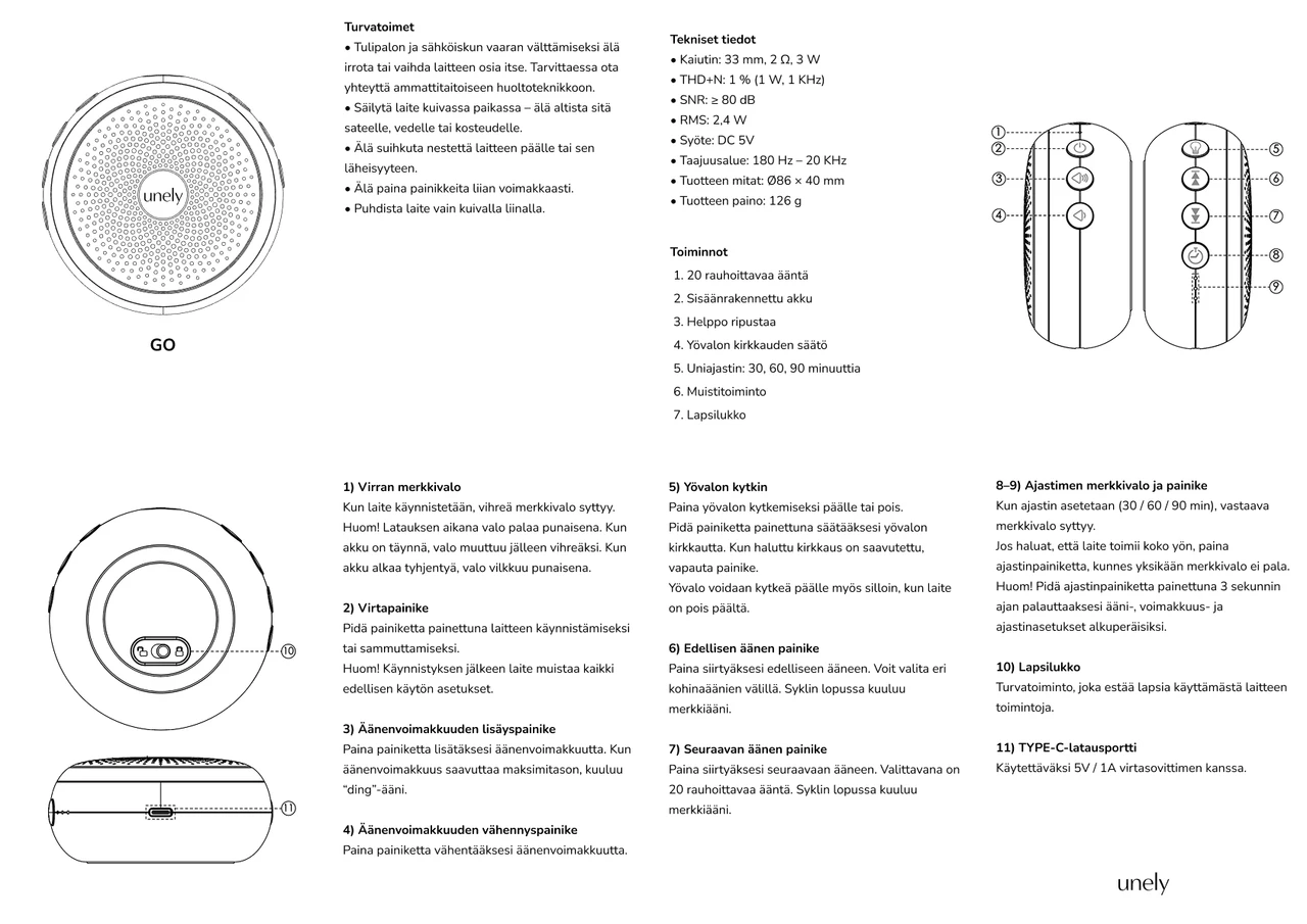 Unely GO on perheelle, joka haluaa ottaa kohinakoneen mukaan – se on mukava, kevyt ja siinä on pieni yövalo. Sopii myös kotikäyttöön.